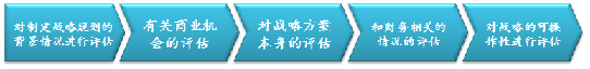 (2)约束和政策:这就是要找到环境和机会与自己组织资源之间的平衡。要找到一些最好的活动集合,使它们能最好的发挥组织的长处,并最快地达到组织的目标。这些政策和约束所考虑的机会是现在还未出现的机会,所考虑的资源是正在寻找的资源。